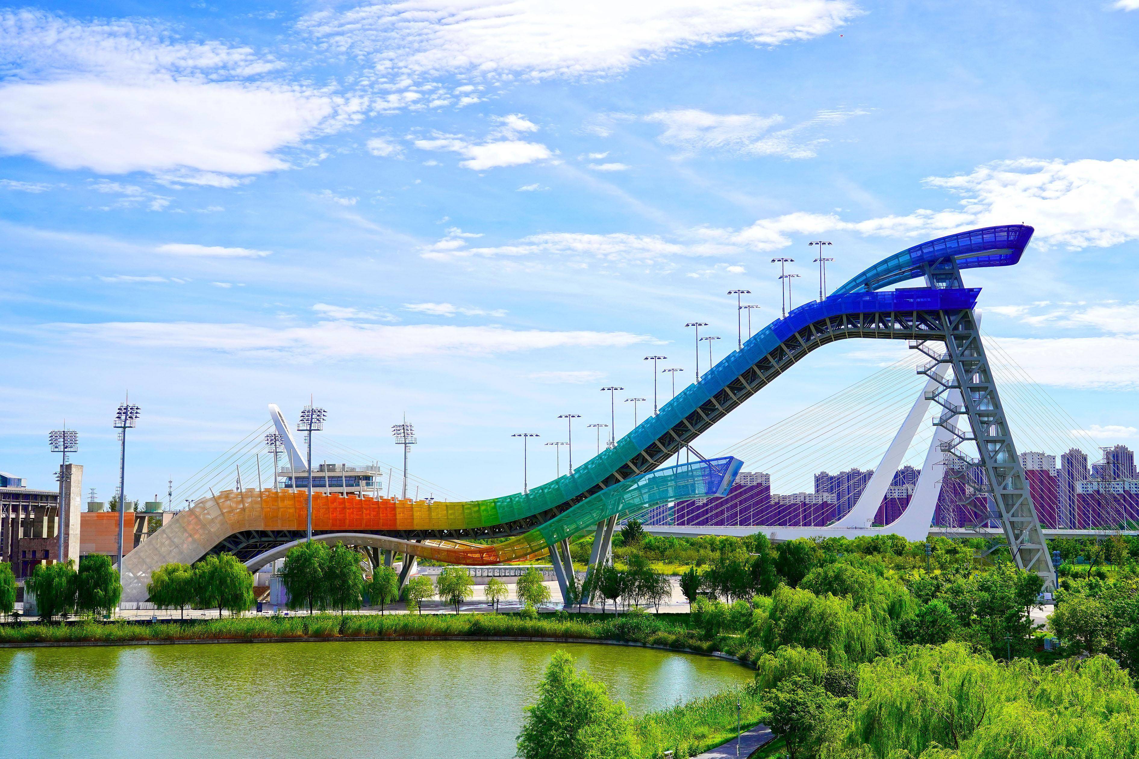 2024年9月5日,北京,蓝天白云下的首钢滑雪大跳台,初秋美景如画。