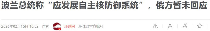 1.《波兰总统称“应发展自主核防御系统”,俄方暂未回应》2026年02月16日 10:52|来源:环球网