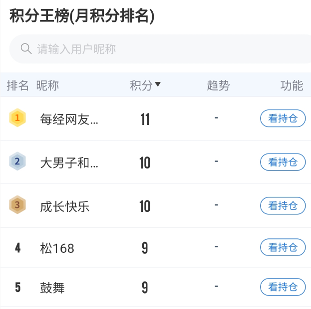 从10月的月度积分王来看,选手“每经网友116271”以11分位居第一,选手“大男子和小女子”以10分位居第二,选手“成长快乐”以10分位居第三。根据比赛规则,当月度总积分相同时,以当月最后一期比赛的收益率进行排名,前100名选手都将获得现金奖励。