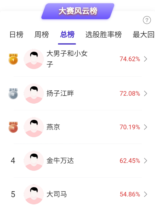 在每日经济新闻App举办的掘金大赛中,第76期比赛于今日结束,多位选手抓住了行情。其中冠军收益率74.62%,亚军收益率72.08%,季军收益率70.19%。本期比赛共833名选手取得正收益,他们都将获得现金奖励。
